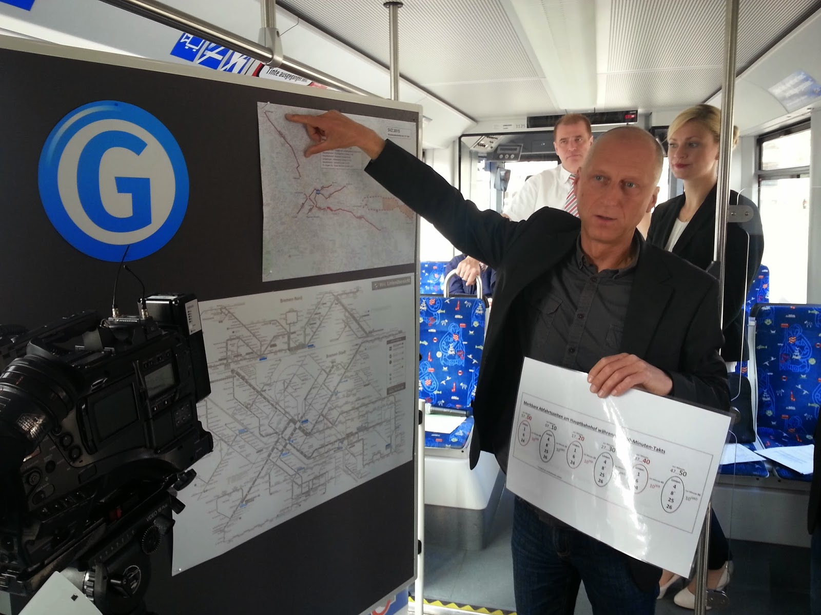 | Michael Rode präsentiert den Fahrplan in einer BSAG-Bahn |