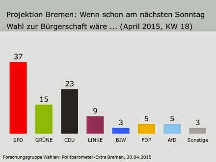 Die Umfragen zu diesem Politbarometer Extra wurden von der Mannheimer Forschungsgruppe Wahlen durchgeführt. Die Interviews wurden in der Zeit vom 27. bis 29. April 2015 unter 1013 zufällig ausgewählten Wahlberechtigten im Land Bremen telefonisch erhoben. Die Befragung ist repräsentativ für die dortige wahlberechtigte Bevölkerung. Der Fehlerbereich beträgt bei einem Parteianteil von 40 Prozent gut +/- drei Prozentpunkte und bei einem Parteianteil von 10 Prozent gut +/- zwei Prozentpunkte.