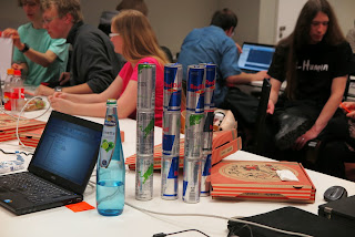 An langen Tischreihen saßen sie. Informatikstudenten, Schüler und Frickler, die sich von Freitagabend bis Samstagvormittag ganz dem Programmieren und Hacken verschrieben hatten. Als Nahrung gab es Berge kostenloser Pizza, Gratis-Bäche Red Bull und hipsterfreundliches Club Mate. Organisator Johannes Hackbarth schmuzelt: „Wer programmiert, braucht schließlich die richtige Nahrung.“