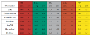 Die Mitte (7.065 Wähler; Wahlbeteiligung: 55,2, 2011: 59,7) ) ist und bleibt Rot-Grün (SPD 24,01; 2011: 29,4), (Grüne 27,45, 2011: 36). Die CDU erzielt mit 14,68 im Vergleich zur vorherigen Legislatur (14,9) ein stabiles Ergebnis. Die Linken kommen auf 14,97 (vorher 8,2) und die FDP auf 7,16 (von 2,6). Für die AfD gibt es 3,69 Prozent.