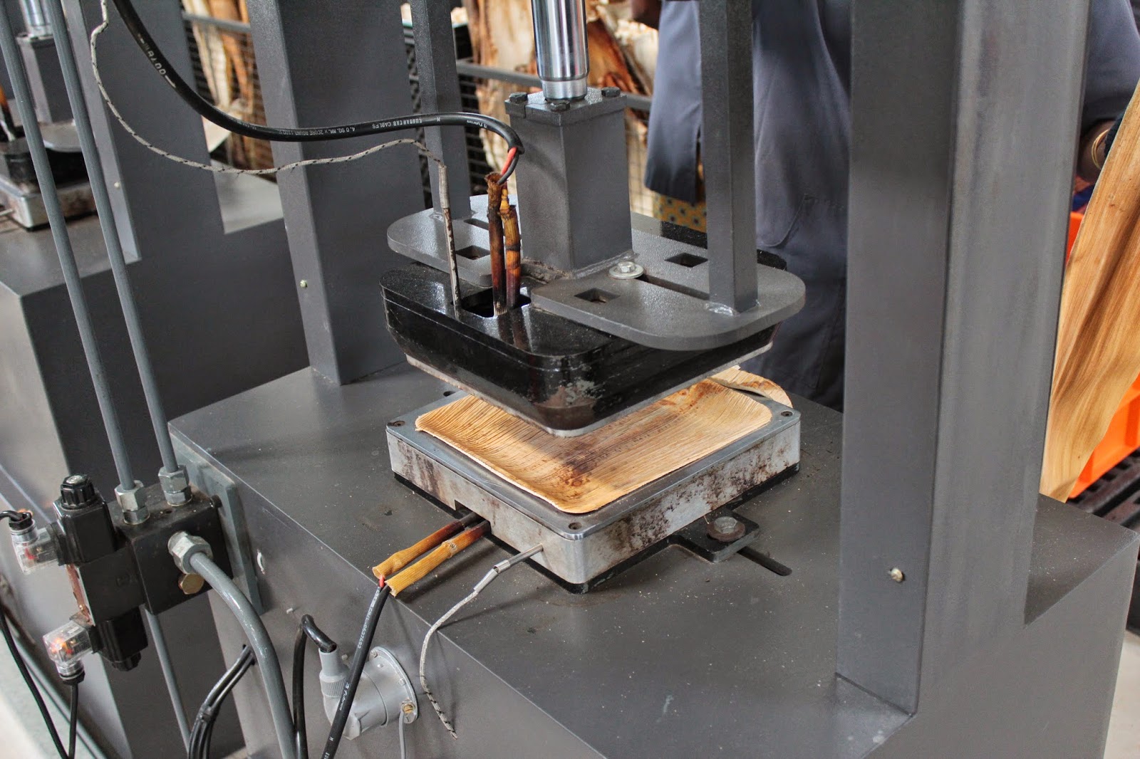 Die Palmblätter werden zunächst gewaschen, gebündelt und getrocknet. Czichos: „Das Waschwasser wird gesammelt und zur Bewässerung wieder verwendet.“ Anschließend werden die Palmblattartikel mittels hydraulischer Pressen in Form gebracht. Danach werden sie entgratet und poliert.