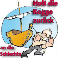Indes herrscht auf dem Holzschiff mittlerweile Hochbetrieb. Unter der Leitung von Andrè Stuckenbrock sind neun Langzeitarbeitslose derzeit damit beschäftigt, die alte Technik und den Motor zu demontieren: „Das wird noch zwei bis drei Wochen dauern. Danach wird die Kogge begutachten und ein Plan für das weitere Vorgehen festgelegt.“