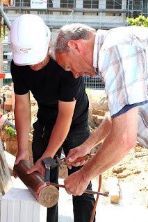 | Bevor die Kupferröhre mit Dokumenten, Euro, Cent, Yuan, Jiao und Fen eingemauert wurde, löteten die Arbeiter sie fachgerecht zu. |