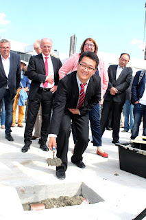 | Zhu Sinan bei der Grundsteinlegung (im Hintergrund Bürgerschaftspräsident Christian Weber, Sozialsenatorin Anja Stahmann und Yonggui Pei. |