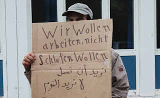 | Arbeiten, statt schlafen: Dieser Flüchtling teilt sich auf einem Plakat mit. Foto: Waalkes |