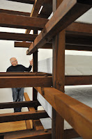 Minimalistisch und humorvoll (wenn man möchte) geht es im oberen Stockwerk der Galerie weiter. Dort findet der Besucher unter anderem eine weiße filigrane Skulptur vor, die der Künstler aus Kunststoffrohren gefertigt hat. Die Rohre sind mit Watte und Mullbinden umwickelt und fügen sich poetisch-stimmig in den Raum ein.