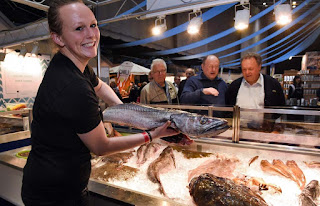 | Katharina Michael vom Alfred-Wegener-Institut präsentiert einen vor Norwegens Küste von den Cuxhavener Kutterfischern gefangenen Seehecht. Fotos: Schlie |