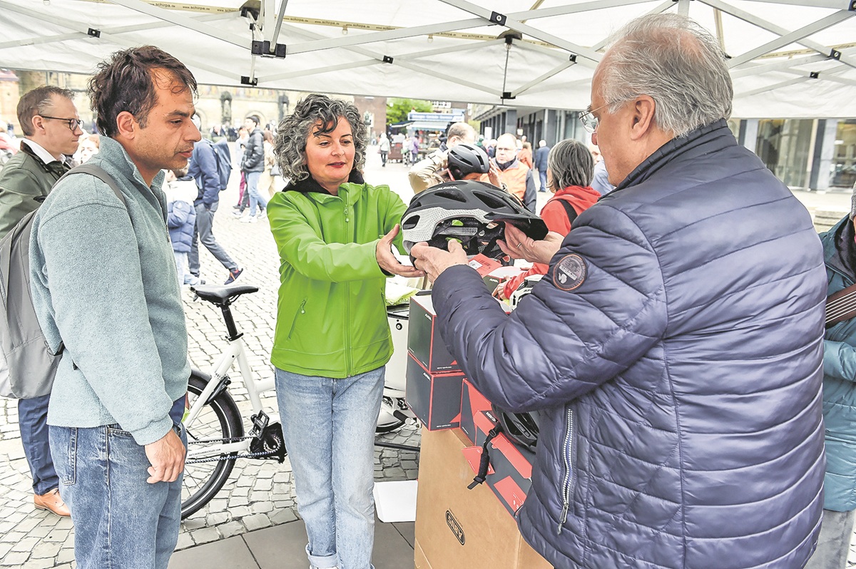 Die Aktion „Mit dem Rad zur Arbeit“ (MdRzA) der AOK geht in die 21. Runde. Tine Klier (Sparkasse Bremen), Rüdiger Meyer (ÖVB Versicherungen) und Hans-Peter Jakst (Zweiradcenter Jakst) als Vertreter der drei Hauptsponsoren und Ronald Gotthelf (ADFC) verschenkten kürzlich gemeinsam mit Jörg Twiefel, stellvertretender Vorsitzender der AOK Bremen/Bremerhaven zum Auftakt auf dem Marktplatz Fahrradhelme und Warnwesten für den Auftakt.