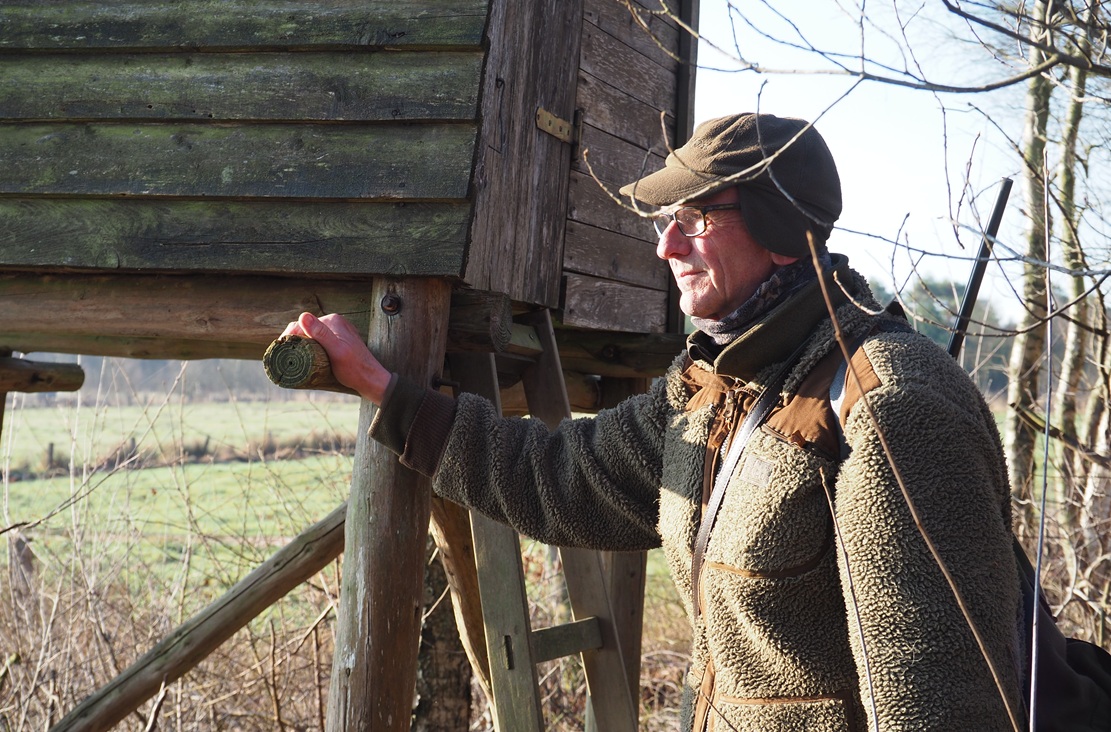 Über Sandhausen geht die Sonne auf, Dunstschleier hängen noch am Boden des Moores. Auch wenn es ein schöner Tag werden wird – noch ist es kalt. Der Jäger Ralf Jonas hat eine Thermoskanne dabei und sitzt in vielen Kleidungsschichten verpackt im Hochsitz „Alte Grüne“. Jeder Hochsitz habe einen Namen, verrät er. Der Plan für die kommenden Stunden sieht eigentlich keinen Abschuss vor, das Gewehr ist dennoch dabei. Über die aktuellen Sorgen und Nöte der Jägerschaft hat Jonas einiges zu erzählen.
