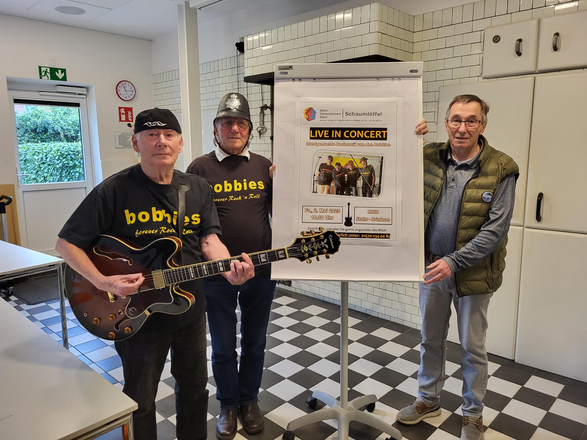 Zu den Tourdaten der vier Rentner gehört erneut das Mehr-Generationen-Haus in Stuhr-Brinkum. Schon im vergangenen Jahr begeisterten sie die Leute dort mit ihrer Live-Musik. Im Rahmen der Veranstaltungsreihe „Damals wars“ spielen die Bobbies am Freitag, 2.Mai, ab 18.30 Uhr. Interessierte können zwei bis drei Stunden lang kostenlos den Auftritt inklusive Pause genießen. Spenden gehen zugunsten des MGHs.