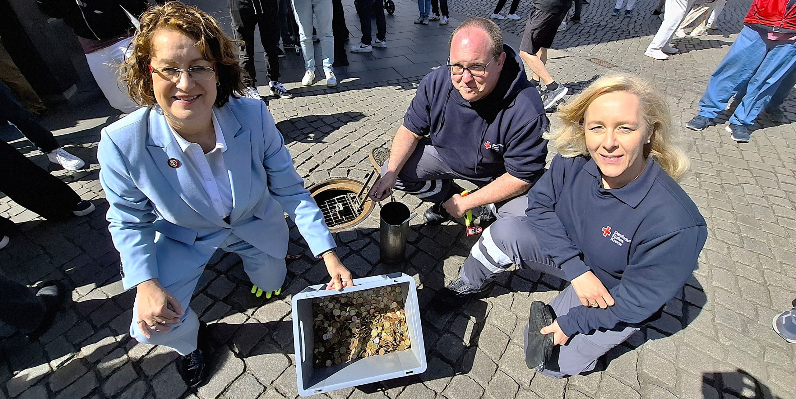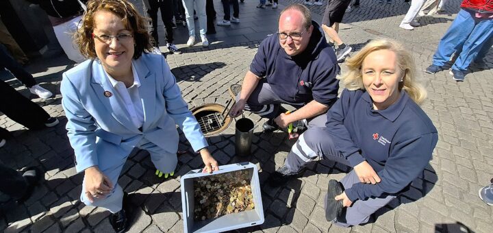Tausende Euro werfen Touristen und Einheimische jährlich in das „Bremer Loch“ der Wilhelm-Kaisen-Bürgerhilfe. Zum Dank hören Sie ein Krähen und Maunzen der Stadtmusikanten. Britta Kujamska und Dennis Dufeu (DRK) holten die Münzen in dieser Woche heraus. Bürgerschaftspräsidentin Antje Grotheer entdeckte auch „einen Deckel mit Werder Raute“. Noch besser: Es waren auch 31.890,66 Euro für die Arbeiterwohlfahrt (AWO) drin.