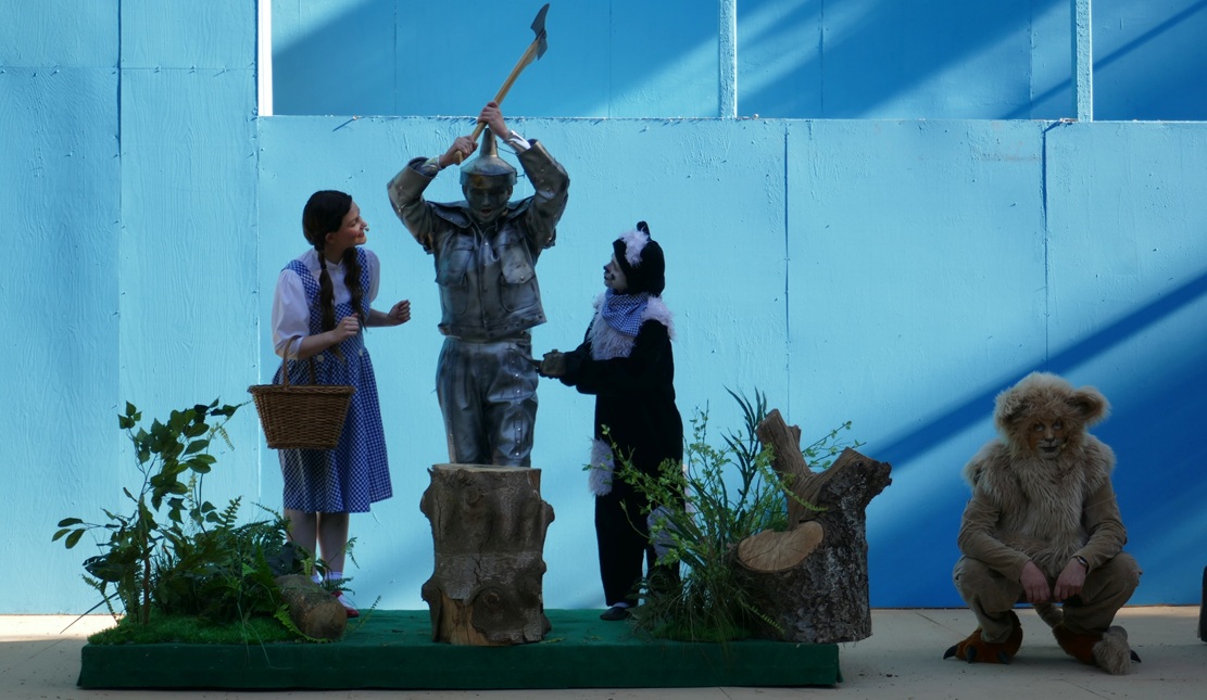 Lücken hat schon öfter auf der Freilichtbühne gespielt, dieses Mal habe sie ihre schönste Rolle „ eine junge Frau“, die im Laufe des Stückes zu sich selbst findet. Hansen musste für ihre Rolle erst einmal das Bellen lernen und Balzer als Löwe das laute Brüllen, war im Vorgespräch zu erfahren. Einen Mischmasch aus Mensch und Blechbüchse – mit leerem Körper, das Herz wurde vergessen – spielt Müller. Die steifen Bewegungen musste er in seinem schweren, dicken Kostüm einüben. In die Rolle der Vogelscheuche schlüpfte Brase: „bin total ausgestopft, habe überhaupt keinen Verstand“, beklagt er in seiner Rolle.
