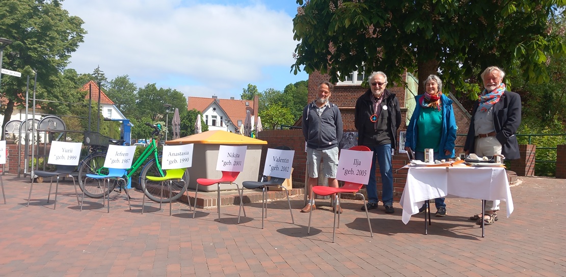 „Tendenzen, die Kriegsverbreitung im weitesten Sinne bedeuten, sehen wir kritisch“, so Uli Priester vom Friedensbündnis auf die Frage, wie die Gruppe zum Tag der Bundeswehr steht. Wenn genügend Menschen den Kriegsdienst verweigern würden, würde sich das Thema Krieg erledigen, ist sich Klaus Lies von der Gruppe sicher. Bei strahlendem Sonnenschein sind Stühle am Marktplatz der Kreisstadt platziert, auf denen Namen ukrainischer und russischer Verweigerer und Deserteure stehen, während des Gesprächs verteilen Gruppenmitglieder immer wieder Infomaterial an interessierte Marktbesucher. „Nehmt das Recht in Anspruch“, appelliert Klaus Lies an alle, die überlegen, eine Einberufung zum Kriegsdienst zu verweigern. „Auch Leute, die schon bei der Bundeswehr sind, können nachträglich verweigern“, ergänzt Elke Lies.