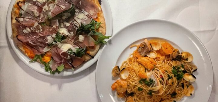 Die Spaghetti Mare von der Mittagskarte kosten 15 Euro. Dafür gibt es eine große Portion feiner Nudeln (natürlich al dente gekocht) in einer nicht zu dominanten, sehr leichten Tomatensauce, mit einem Hauch Knoblauch und Peperoni. Drei perfekt gegarte Scampi, ein butterweiches Stück Lachs und einige dekorative Venusmuscheln runden das geschmacklich elegant ausbalancierte Gericht ab.