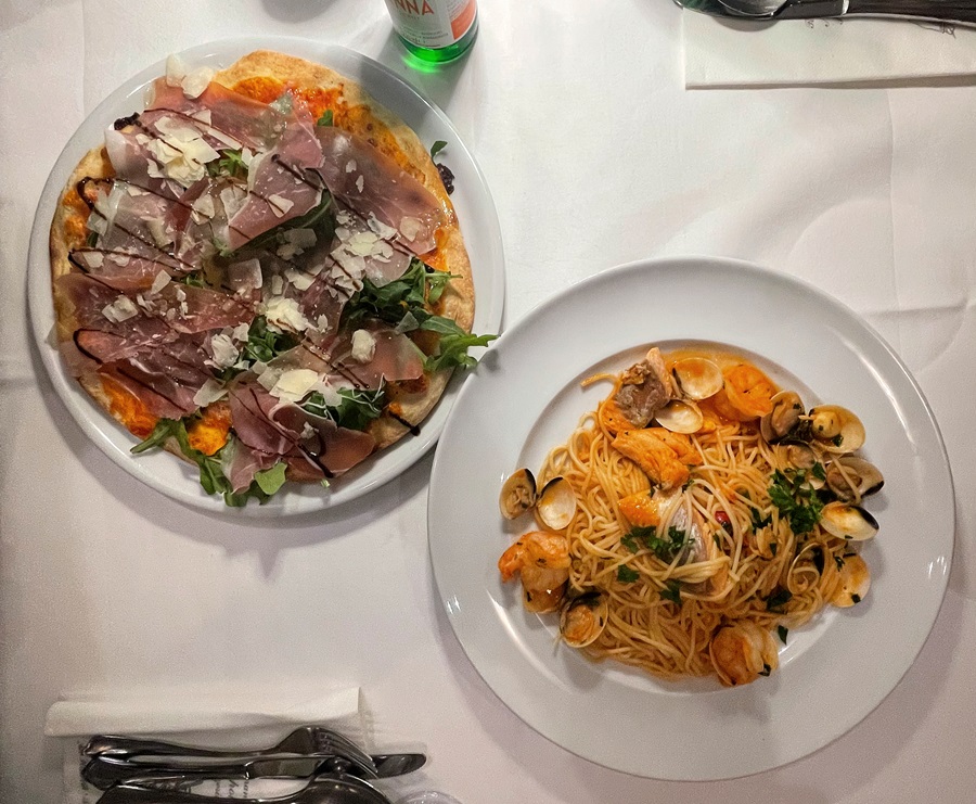 15 Euro für die Spaghetti von der Mittagskarte und 16,50 Euro für die Pizza sind nicht gerade günstig, aber angemessen. Die Getränke sind recht teuer: Ein Wasser (0,25l) kostet 3 Euro, ein Bier (0,3l) 4 Euro und der günstigste Wein (0,2l) 6 Euro.