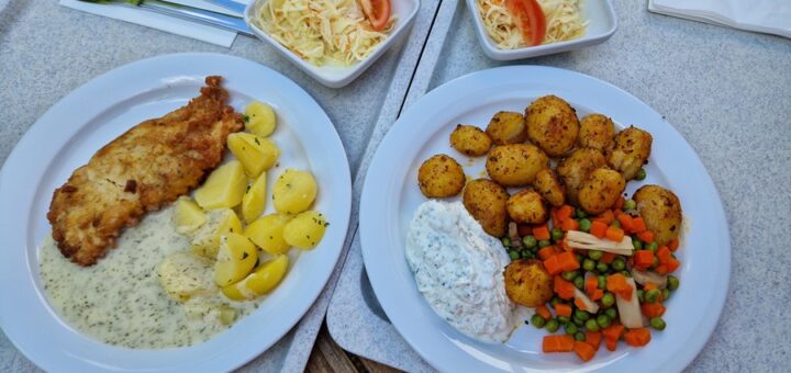 Der Seelachs liegt schon etwas länger da, die Panade ist weich, das Filet bissfest. Andersherum wäre es besser. Dazu gibt es einen Schöpflöffel dünnflüssige Dillsauce, erstaunlich schmackhafte Salzkartoffeln und den leckeren Krautsalat. Weil sie auf unserem Laufweg nicht auftaucht, vergessen wir leider komplett, uns die Kirschspeisen mitzunehmen.