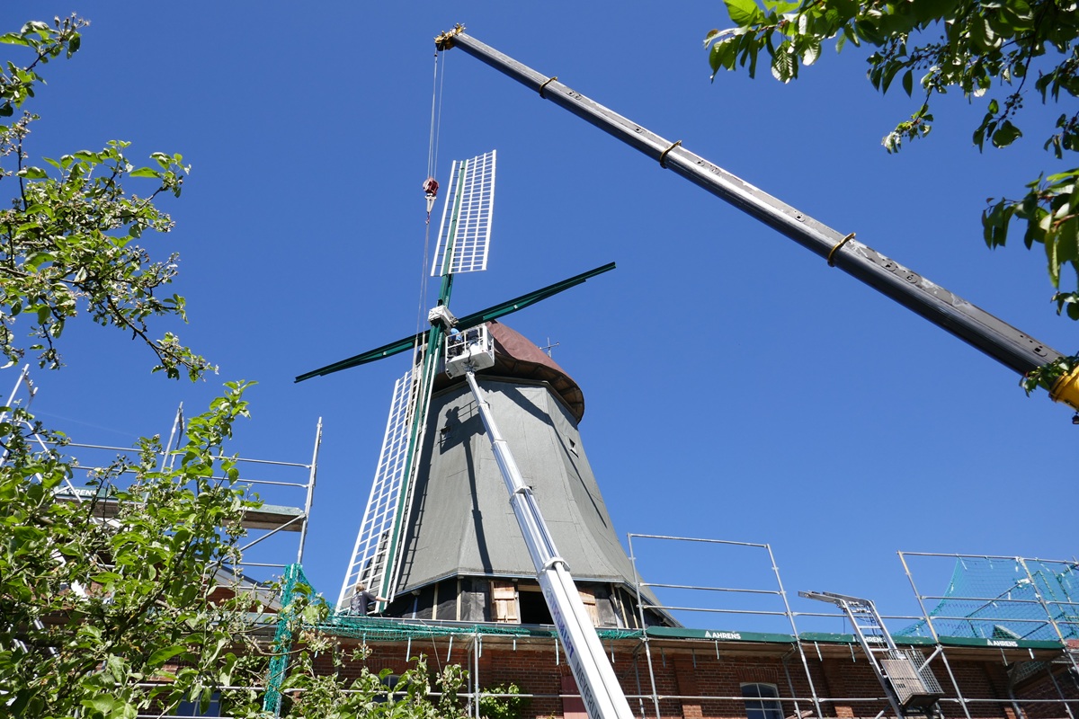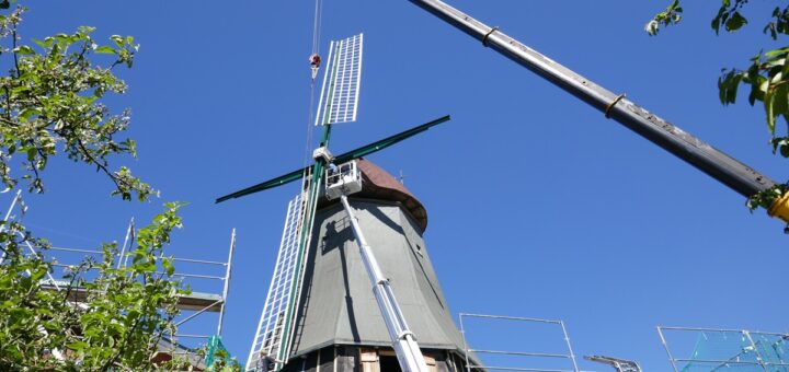 Ein mächtiger Autokran hievte die vier Teile des neuen Flügelkreuzes in die Höhe zum Mühlenkopf. Hier montierten Spezialisten der Firma Pätzmann Mühlen – Maschinenbau die vier aus Aluminium gefertigten Flügelteile. Das neue Gatterwerk für die Mühlenflügel aus pulverbeschichteten Aluminiumprofilen soll für eine dauerhafte Haltbarkeit sorgen, weil hölzerne Flügel durch Wettereinflüsse eher geschädigt würden, erklärte der Dezernent für Stadtentwicklung, Planen und Bauen, Manuel Reichel.