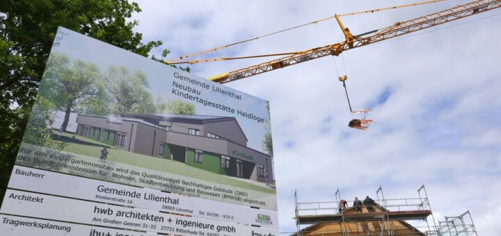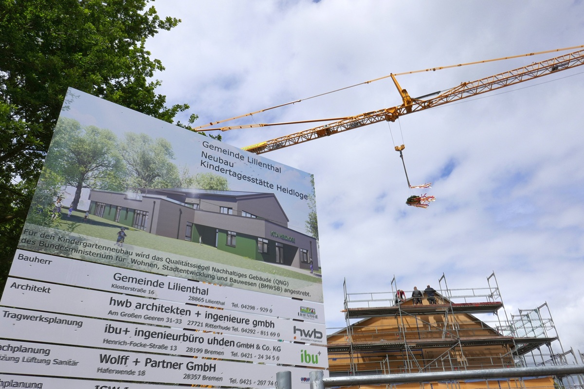 Die Planungen für die Kita Heidloge begannen bereits 2021 mit der Aufnahme erster Mittel im Gemeindehaushalt und der parallelen Änderung des Bebauungsplans. Nun zeugt der Richtkranz mit bunten Bändern von der Fertigstellung des Rohbaus im umweltfreundlichen Holzrahmenbau.
