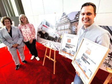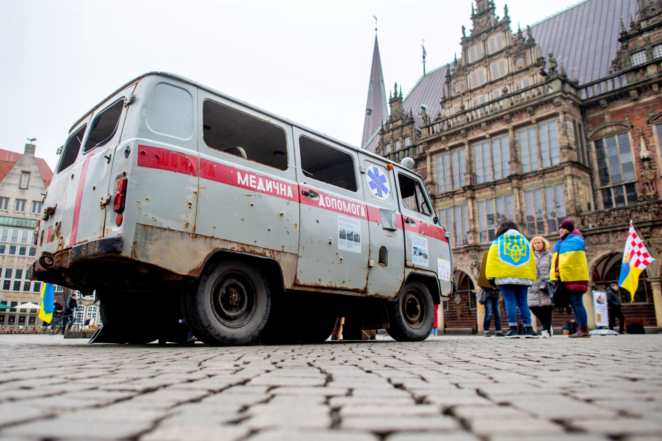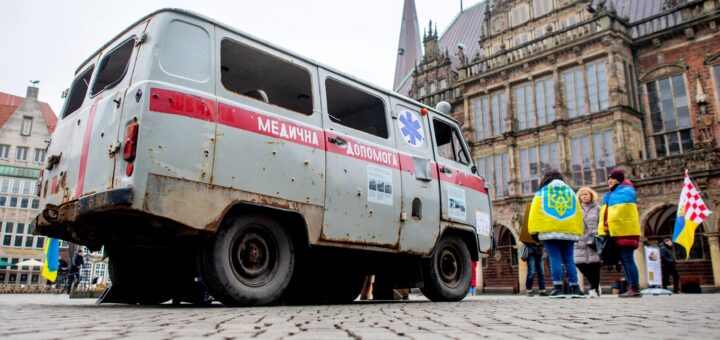 „Ein zerschossener ukrainischer Rettungswagen steht auf dem Marktplatz vor der Bürgerschaft und dem historischen Rathaus“, so beschreibt Hauke-Christian Dittrich sein Foto. Der Oldenburger ist Gewinner in der Sparte Pressefoto beim Bremer Fotopreis 2024. „Das Fahrzeug stammt aus dem Ort Derhatschi in der ukrainischen Region Charkiw und wird derzeit in zahlreichen deutschen Städten als Mahnmal russischer Kriegsverbrechen gezeigt.“ Regine Suling-Williges, Vorsitzende des Veranstalters Deutscher Journalisten-Verband Bremen fragt: „Heute kann doch jeder fotografieren, oder? Ein Schnappschuss mit dem Smartphone – und fertig ist das Bild.“ Die Antwort liefert sie gleich mit: „So einfach ist es nicht.“