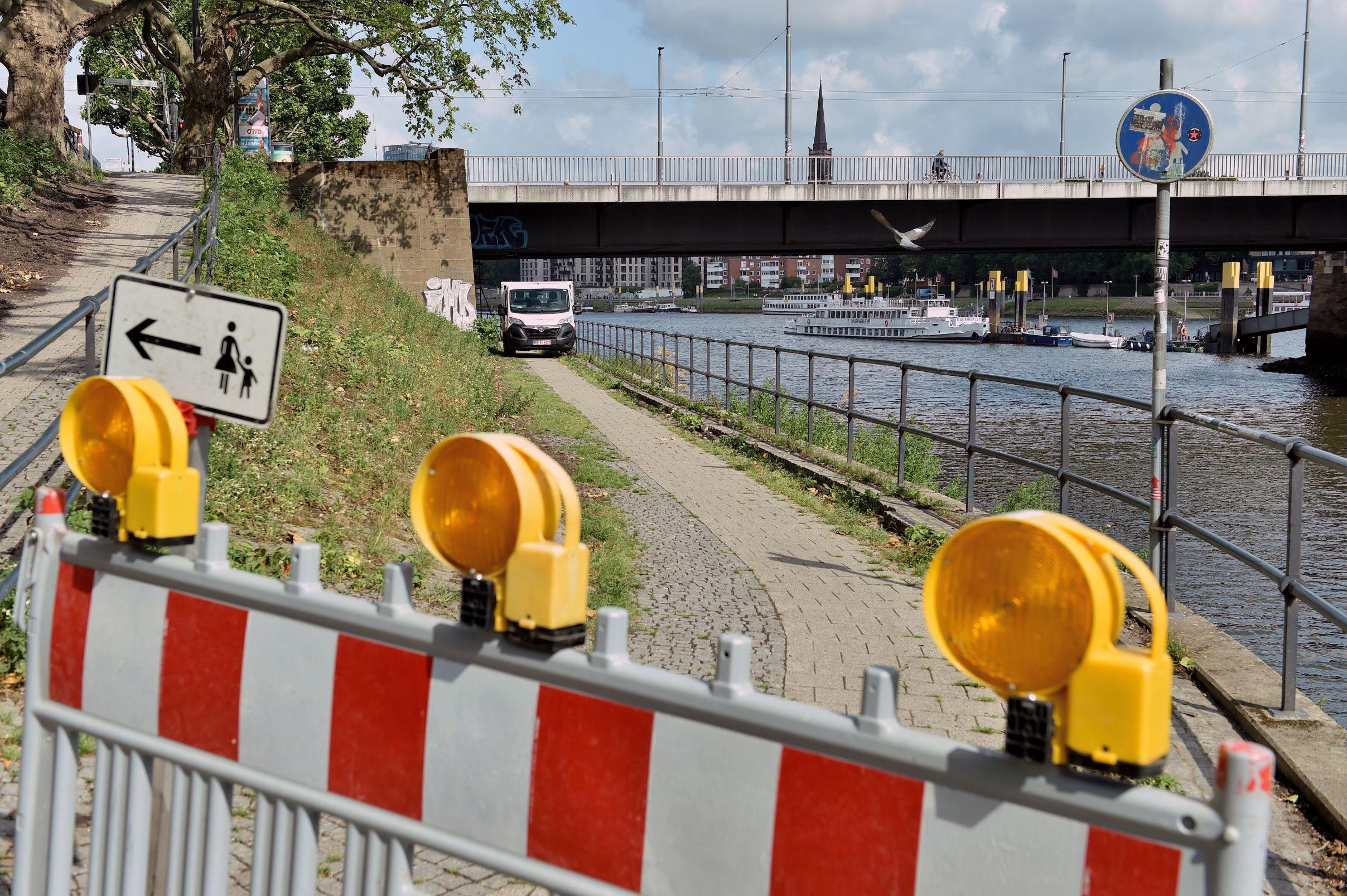 Während der Anlieferung und dem Aufbau der Bauteile bleibt der Uferweg auf der Neustadtseite täglich von 7 bis 17 Uhr gesperrt. Fußgängerinnen und Fußgänger und Radfahrende werden gebeten, alternative Routen zu nutzen. Etwa 30 Tage soll die Umleitung dauern.