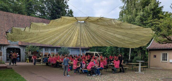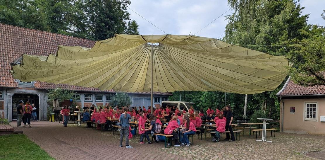 „Wi föhlt us hier bannig wohl“, gestand der Präsident des Niederdeutschen Bühnenbundes, Arnold Preuß am ersten Festivaltag, „dat klappt hier allns!“ Preuß bedankte sich bei den Veranstaltern, dem TIO-Team, das in diesem Jahr zum dritten Male das Jugendtheater-Festival ausrichtete. Mit rund 41 Helferinnen wurde alles vorbereitet und im Hof ein riesiger Fallschirm als Sonnen- und Regenschutz aufgebaut, den der Lions Club zur Verfügung stellte.