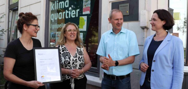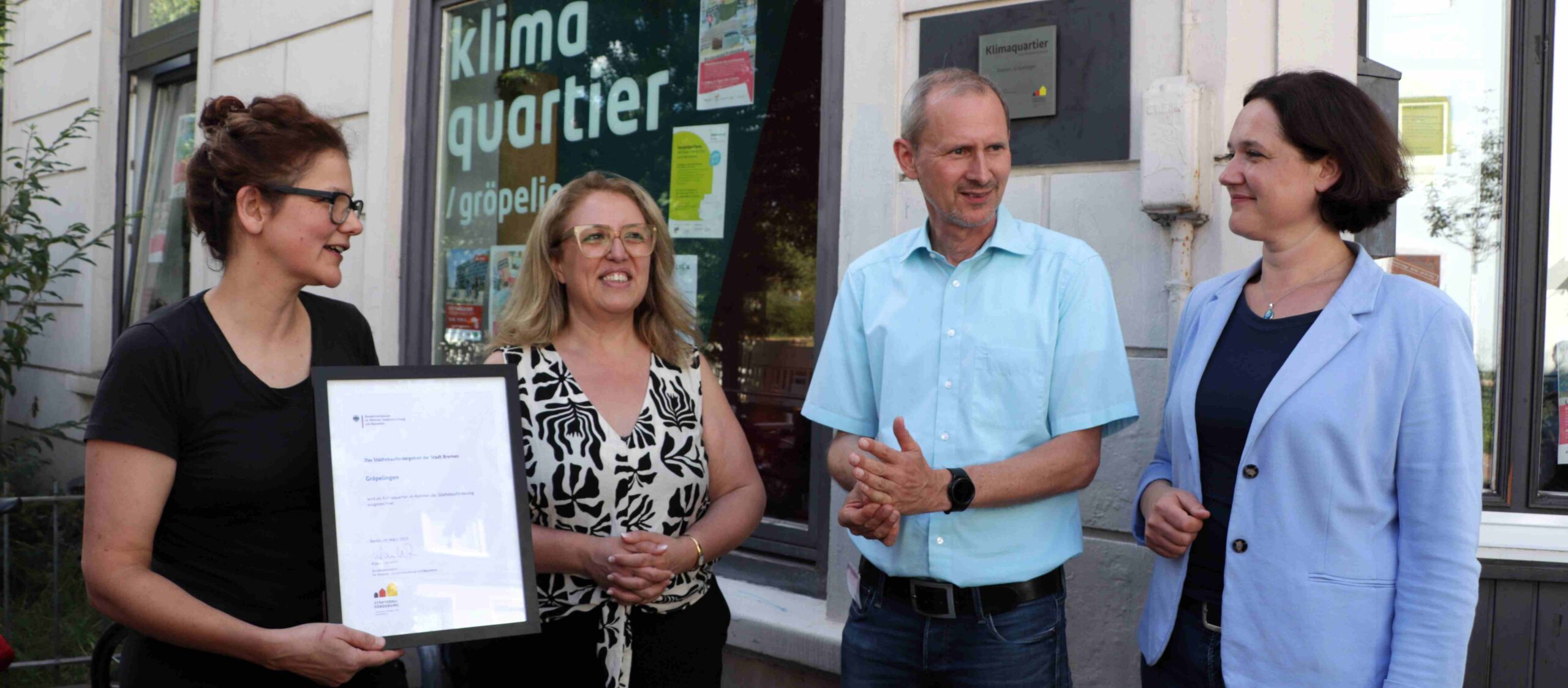 Alke Rockmann (v.l.) vom Klimaquartier Gröpelingen mit Bausenatorin Özlem Ünsal, Energie-Konsenz-Geschäftsführer Martin Grocholl und Klimaschutzsenatorin Kathrin Moosdorf mit der Anerkennungsurkunde für das Klimaquartier von Bundesministerin Klara Geywitz. Foto: Bollmann