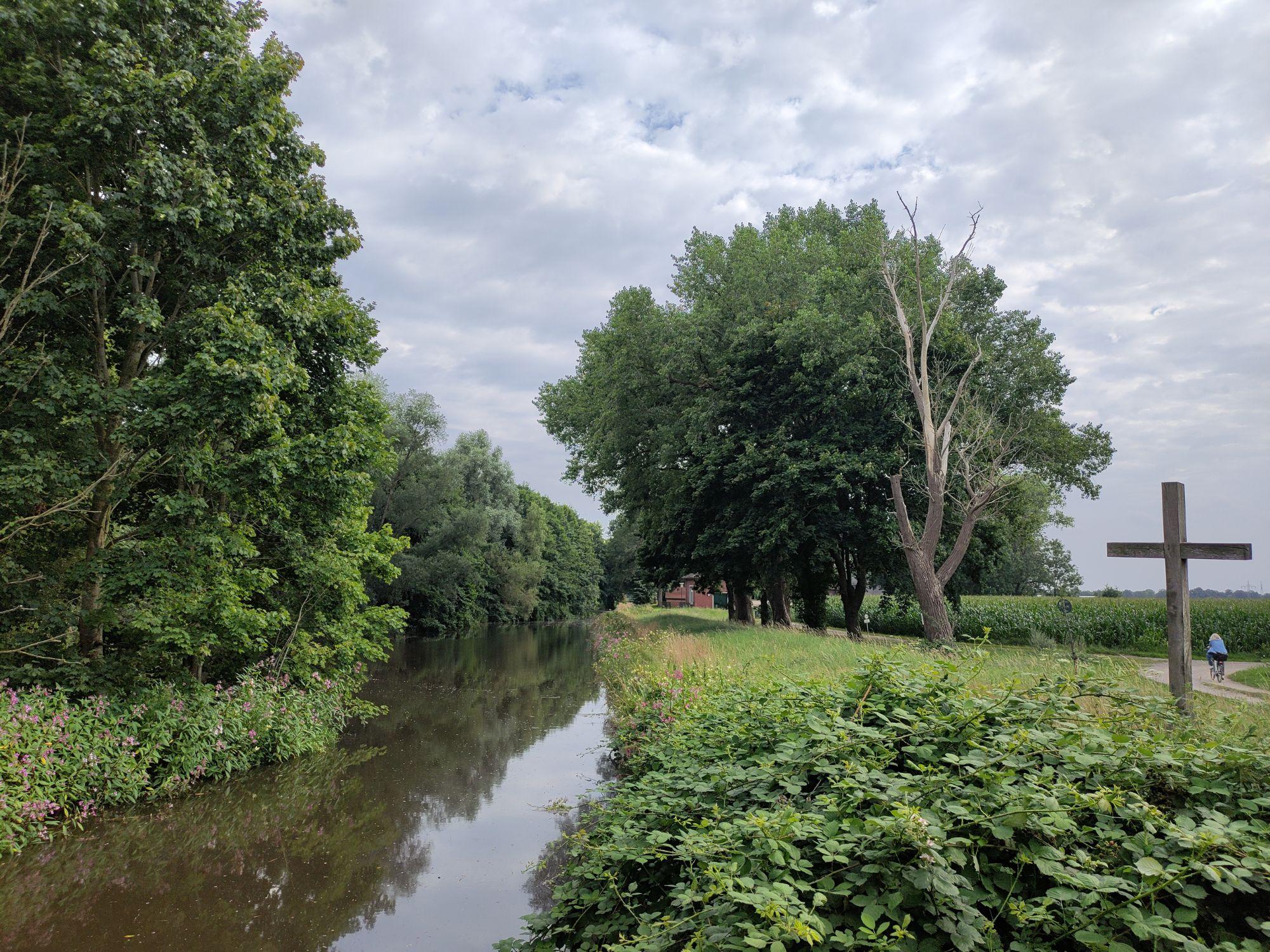 Wer sich vom Ausblick losreißen kann, wandert auf der Brokhuchtinger Landstraße weiter gen Süden. Zwar ist die Straße für den Autoverkehr freigegeben, viel befahren ist sie jedoch nicht. Ein Abstecher in eine Seitenstraße Richtung Varreler Bäke führt zum Pilgerkreuz Brokhuchting – eine der Sehenswürdigkeiten entlang der Route. Dort lädt eine Bank zum Ausruhen ein, mit Blick auf den namensgebenden Fluss.