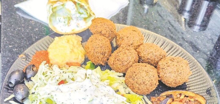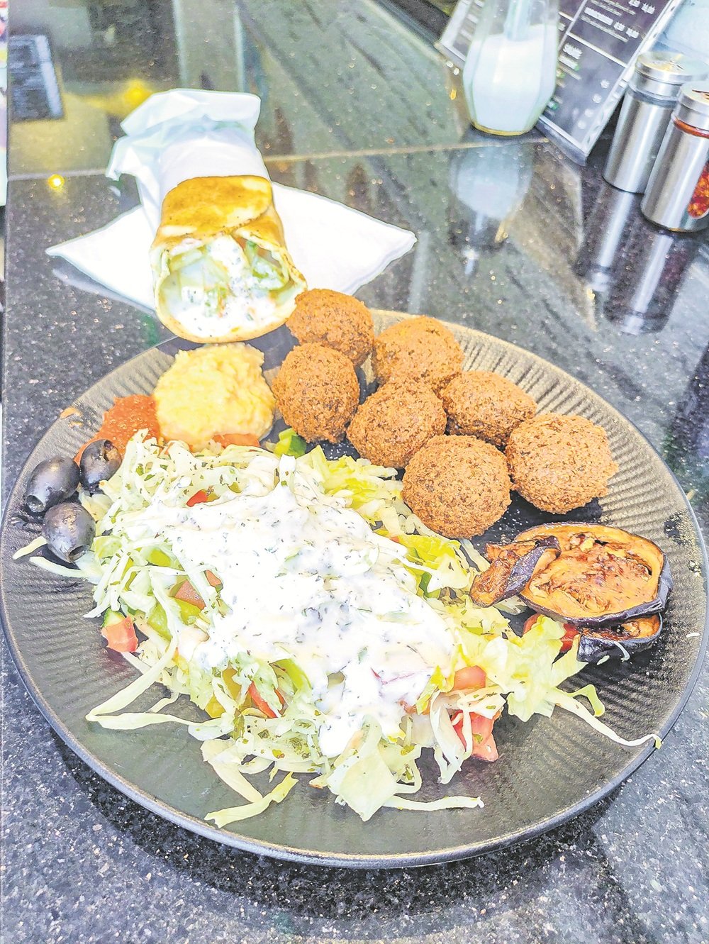 Für 8,50 Euro gibt es einen Falafel-Teller. Sieben Falafel-Bällchen, Krautsalat, ein wenig eingelegte Aubergine, drei Oliven und ein Klecks Hummus werden dazu auf einem Plastikteller angerichtet. Die Portionsgröße halten wir in Hinblick auf den Preis für angemessen, etwas mehr Oliven hätten jedoch auf dem Teller sein dürfen. Auch eine größere Portion Hummus hätte zumindest einen Ausgleich schaffen können, da die Falafel leider ein wenig zu trocken sind. Der Salat hingegen ist knackig frisch und die leichte Joghurt- Soße überzeugt durch eine gute Würzung. Für sechs Euro gibt es einen kleinen Halloumi-Rollo, gefüllt mit demselben Krautsalat wie auf dem Falafel-Teller. Positiv fällt auf: An Halloumi wurde nicht gespart und der Rollo fällt trotzdem ziemlich groß aus. Geschmacklich überzeugt er außerdem mit einer angenehmen Schärfe und einer guten Menge an der würzigen und leichten Soße. Nur das Brot ist etwas zu kross gebacken, sodass es an einigen Stellen auseinander bricht und die Füllung herausfällt. Da der Rollo auch „zum hier essen“ ohne Teller herausgegeben wird, müssen später dann Servietten als Unterlage zum Einsatz kommen, als das Einwickelpapier von der Soße durchgeweicht ist.