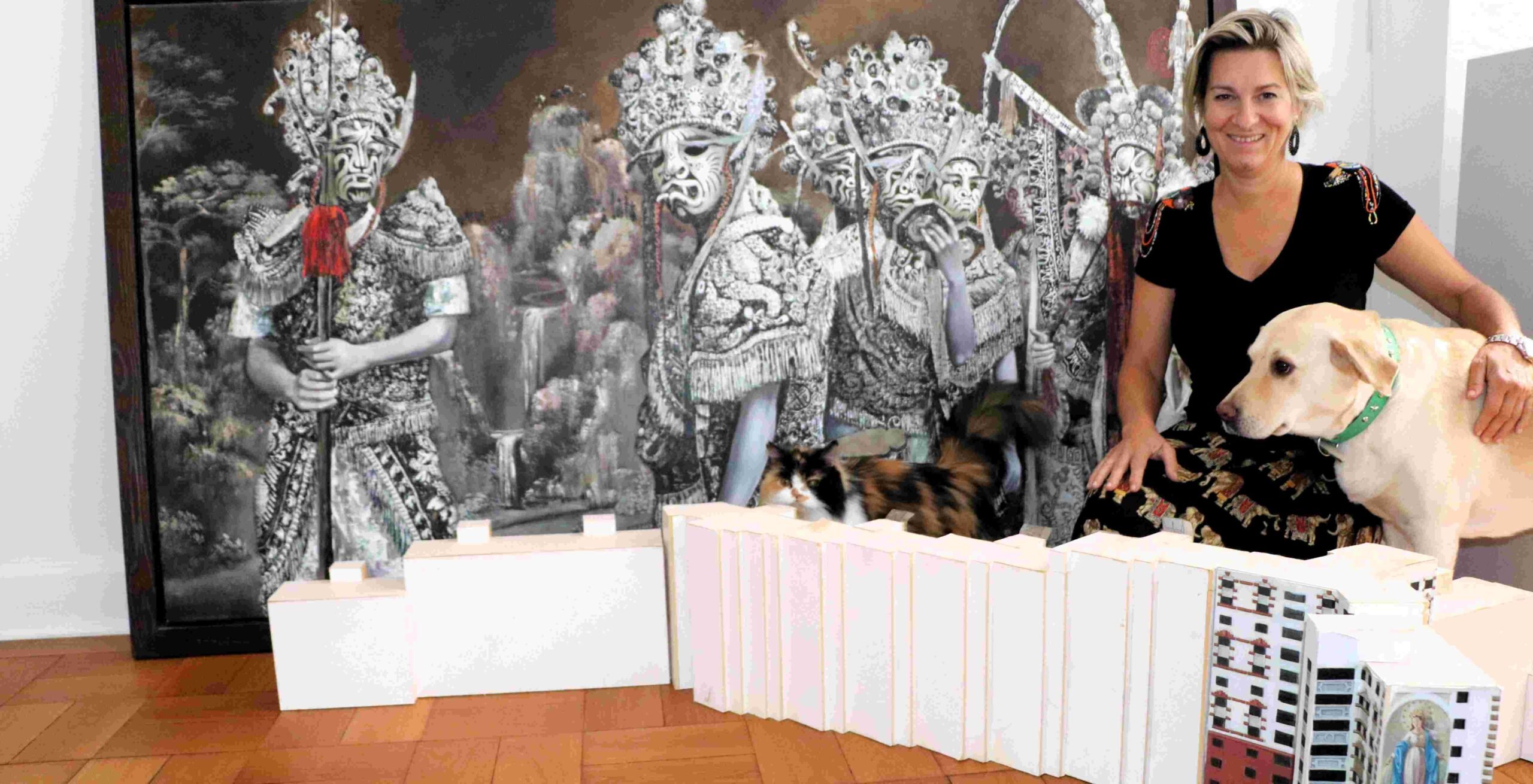 Der erste Bauabschnitt des Wohnprojektes ist bereits fertiggestellt: Die Fenster und Balkone wurden mit grafischen Mustern versehen und die Fassade prägt nun eine zwölf Meter hohe Maria-Abbildung. Mit dem zweiten Bauabschnitt wurde gerade erst begonnen. Damit man eine bessere Vorstellung von der Größe des Projektes bekommt, hat Kudor in ihrer Galerie C&S Kunsthandel ein Modell von dem Wohngebäude aufgebaut, auf dem man auch den fertiggestellten ersten Bauabschnitt mit der Maria-Figur erkennen kann.