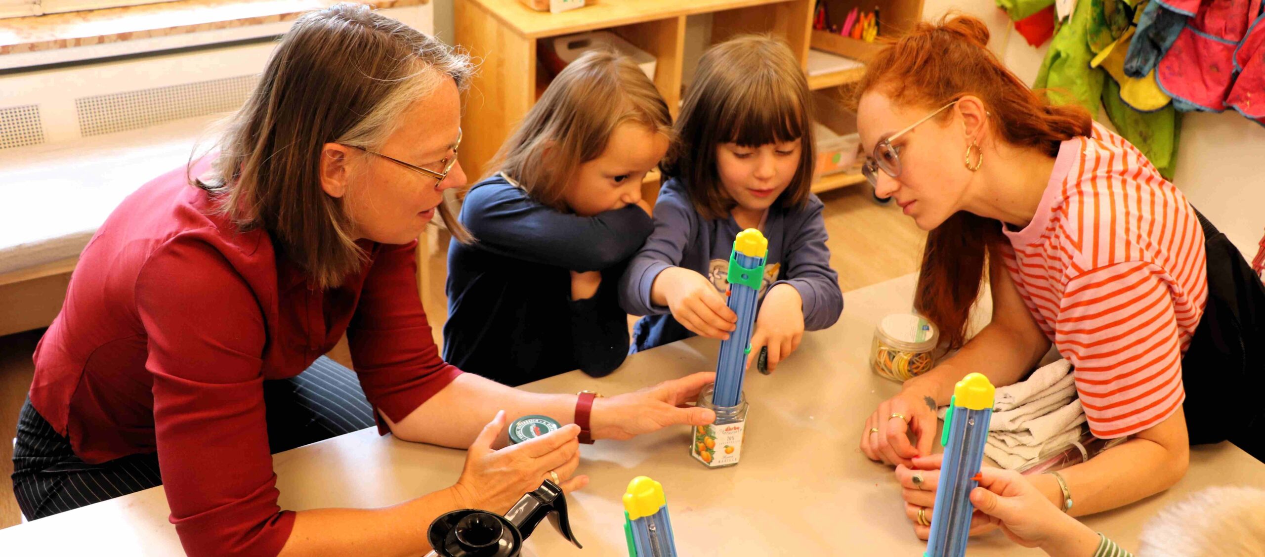 Bevor sich Aulepp die weiteren Besonderheiten der Einrichtung zeigen ließ, stand aber erst einmal der Forschungsauftrag auf dem Programm. Aulepp setzte sich zu den Kindern während Vogel und Wille zunächst einmal erklärten, dass der Tee in einer Thermoskanne lange warm bleibt. Die Frage für die Kinder war nun, ob sich heiße Flüssigkeiten auch in einem Marmeladenglas warmhalten lassen, wenn man es mit unterschiedlichen Materialien umwickelt. Für den Versuch füllten die Kinder gemeinsam mit Aulepp, Vogel und Wille heiße Flüssigkeit in die Gläser und kontrollierten mit einem Thermometer die Temperatur. Dann umwickelten sie die Gläser wahlweise mit Stoff oder Aluminiumfolie. Danach wurden die Gläser zunächst beiseite gestellt, um nach einiger Zeit noch einmal die Temperatur messen zu können. Am Ergebnis konnten die Kinder dann später ablesen, ob nun der Stoff oder die Aluminiumfolie besser geeignet ist die Temperatur zu halten.