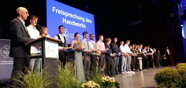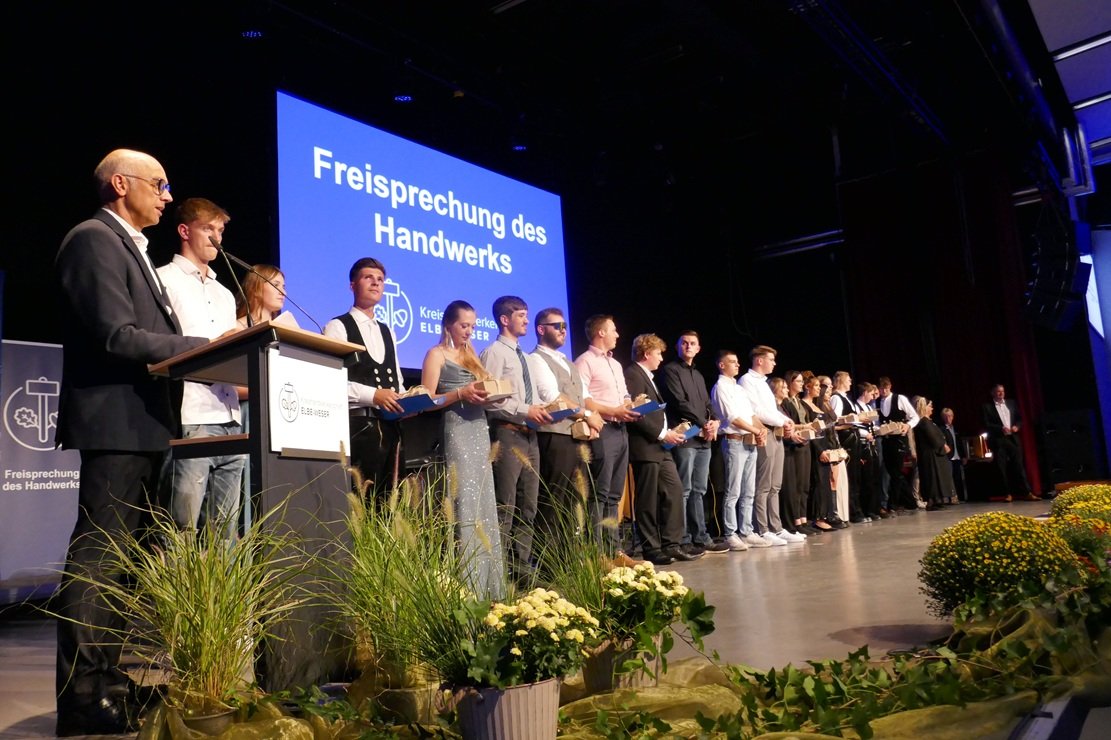 Nun saß der Handwerksnachwuchs in festlicher Garderobe oder traditioneller Handwerkskluft in der Feierstunde zur Freisprechung, um hier ihre Zeugnisse in Empfang zu nehmen. In seinem Festvortrag richtete Schulleiter Sebastian Leitzbach vom Kivinan-Berufsbildungszentrum in Zeven an die erfolgreichen Prüfungsabsolventen und -absolventinnen: „Sie haben sich erfolgreich der Prüfung gestellt und bewiesen, dass Sie nun für den Beruf die erforderlichen Fähigkeiten besitzen“. Somit hätten sich alle Prüflinge eine wichtige Grundlage für den neuen Lebensweg geschaffen. Das Team der Kreishandwerkerschaft mit Geschäftsführer Jan-Peter Halves , der jeweilige Fachlehrer der BBS und Innungsmeister überreichten schließlich den jungen Gesellen und Gesellinnen die Zeugnisse. 19 Absolventen erhielten besondere Auszeichnungen für ihre hervorragenden Leistungen. Zudem erhielt der Zimmerer Jonah Meyer aus Breddorf eine Ehrenurkunde für die beste Prüfungsleistung eines Abschlussjahrgangs.