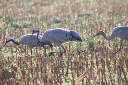 Im Teufelsmoor kann man die Kraniche sehr gut beobachten, wenn sie am Tag auf abgeernteten Feldern Nahrung suchen. Foto: Bollmann