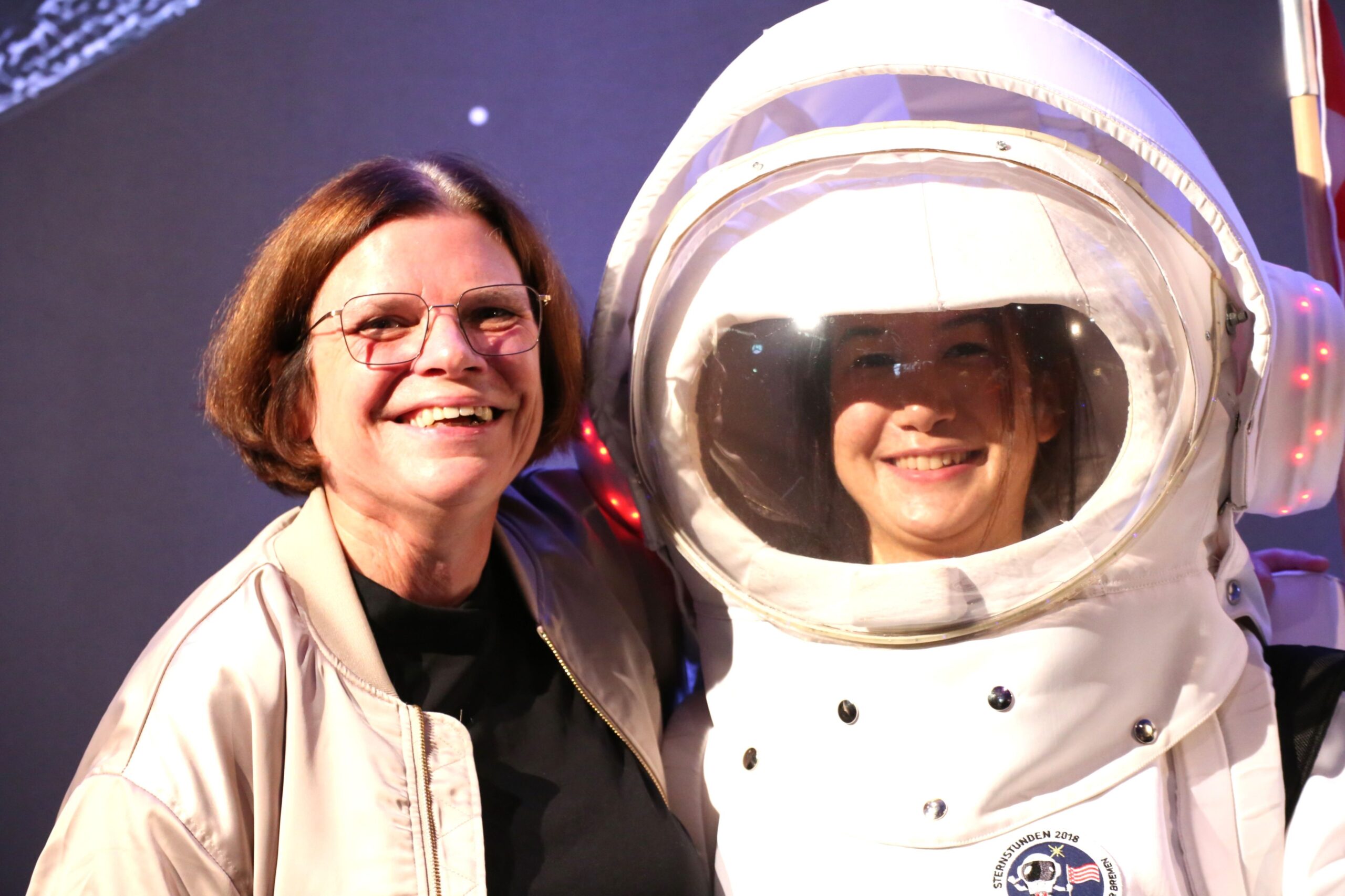Vogt, Raumfahrt, All, Space, Bremen, ESA, Space Hub, Rakete, Satellit, OHB, Ariane, WFB, NASA, Airbus, Messe, Minister Eine Astronautin-Darstellerin zeigt, was Kristina Vogt (l.) vielleicht auch gerne geworden wäre – wenn es eine Schau wie die Space Hub gegeben hätte. Foto: Marcus Schmidt