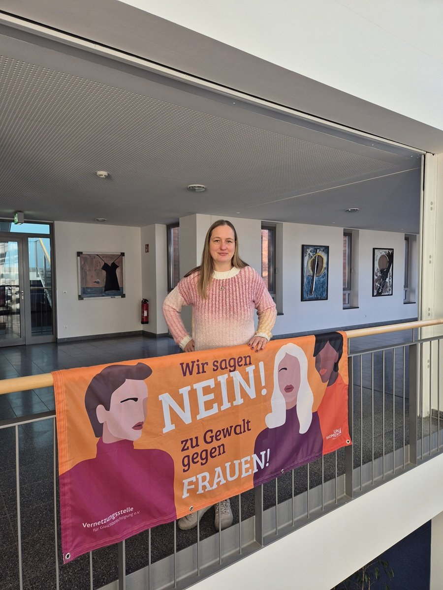 Melanie Zylka hat verschiedene Aktionen für den 25. November in der Kreisstadt initiiert. Das orangene Banner mit der Aufschrift „Wir sagen Nein! zu Gewalt gegen Frauen!“ hängt vom 24. November bis 10. Dezember an der Unterführung Osterholzer Straße. Foto: Lara Stelljes Melanie Zylka hat verschiedene Aktionen für den 25. November in der Kreisstadt initiiert. Das orangene Banner mit der Aufschrift „Wir sagen Nein! zu Gewalt gegen Frauen!“ hängt vom 24. November bis 10. Dezember an der Unterführung Osterholzer Straße. Foto: Lara Stelljes