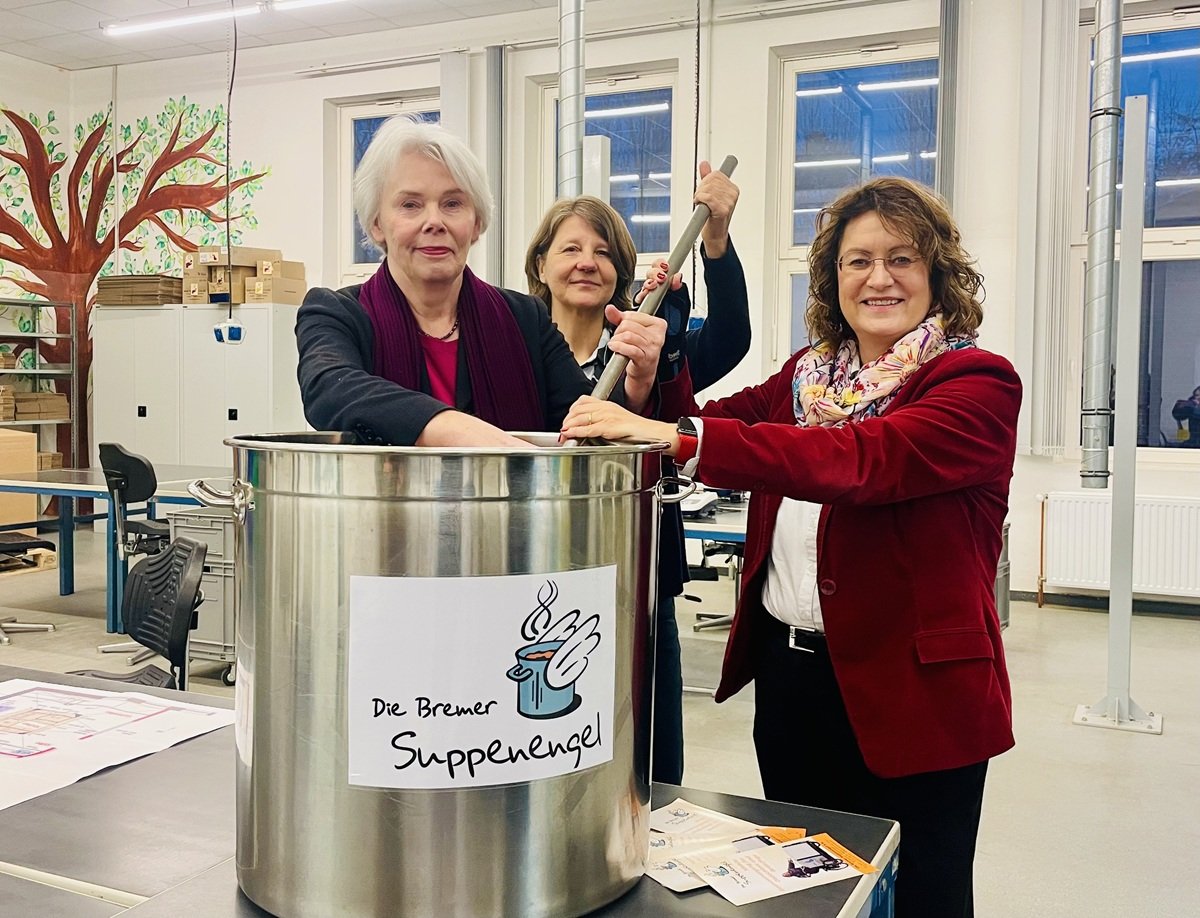 Rund 350 Portionen Suppe oder Eintopf bereiten die ausschließlich Ehrenamtlichen der Bremer Suppenengel täglich aus Spenden zu. Diese verteilen sie an ihren Ausgabestellen an Wohnungslose und andere Bedürftige. Hinzu kommen gute 600 belegte Brote, je nach Spendenaufkommen auch Nachtisch. „Wir kochen mit dem, was uns gespendet wird“, erklärt die erste Vorsitzende des Vereins, Erika Pape-Post.